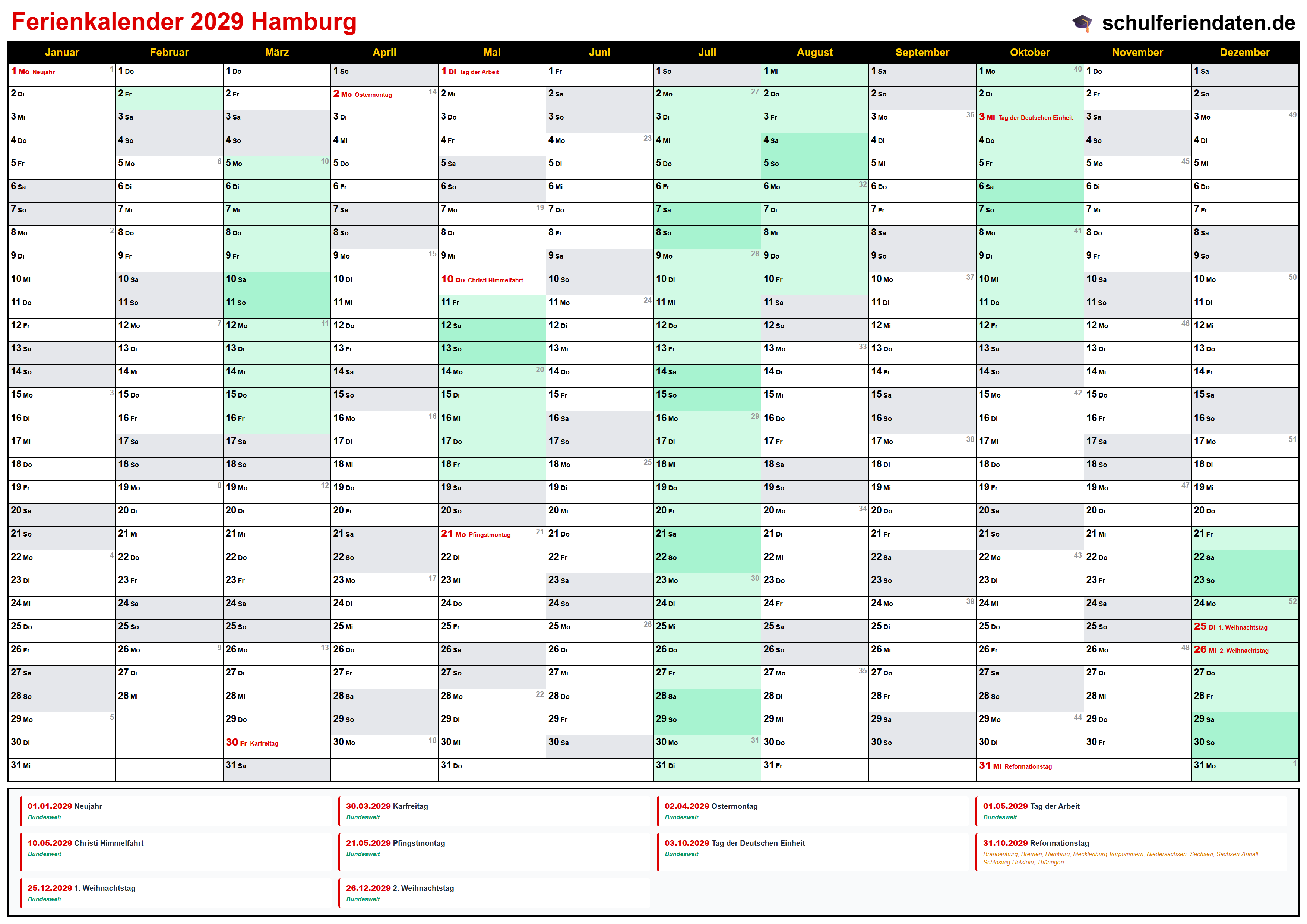 Ferienkalender für Hamburg im Jahr 2029 mit allen Schulferien und gesetzlichen Feiertagen. Der Kalender zeigt alle Termine übersichtlich nach Monaten und Kalenderwochen und steht als PDF, PNG und iCal (.ics) zum Download bereit.