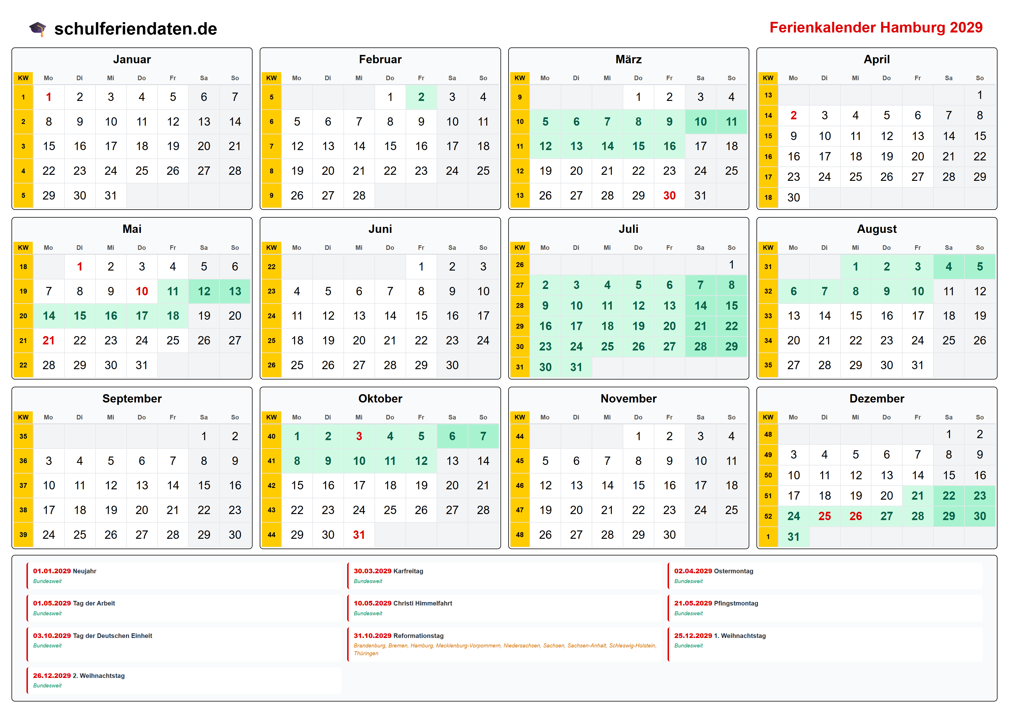 Laden Sie unseren Kalender 2029 mit den Feiertagen für Hamburg in den Formaten PDF oder PNG. Sie können die Kalender auch auf Ihrer Webseite einbinden oder in Ihrer Publikation abdrucken. In dem Fall muss schulferiendaten.de als Quelle angegeben bzw. verlinkt sein.
