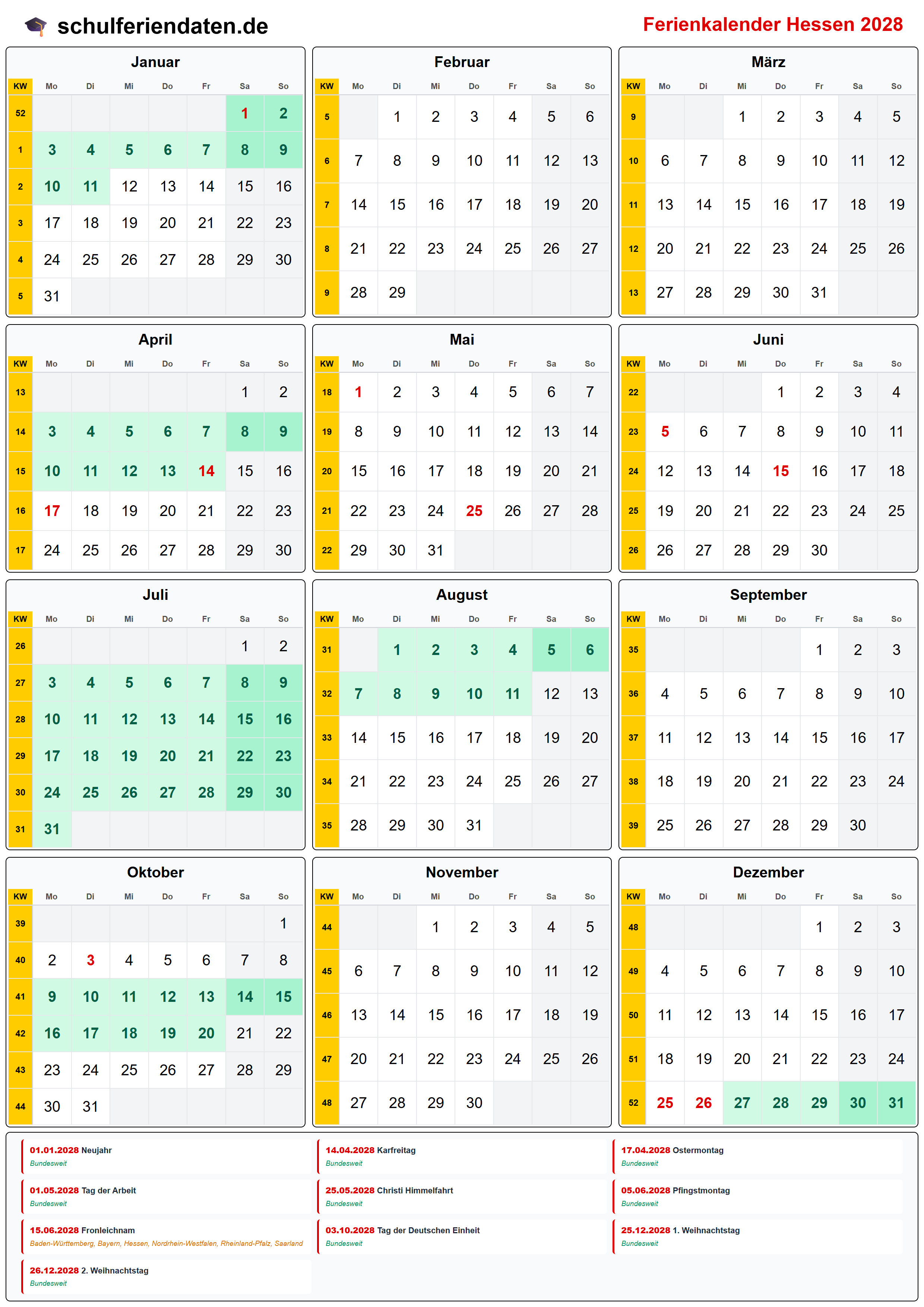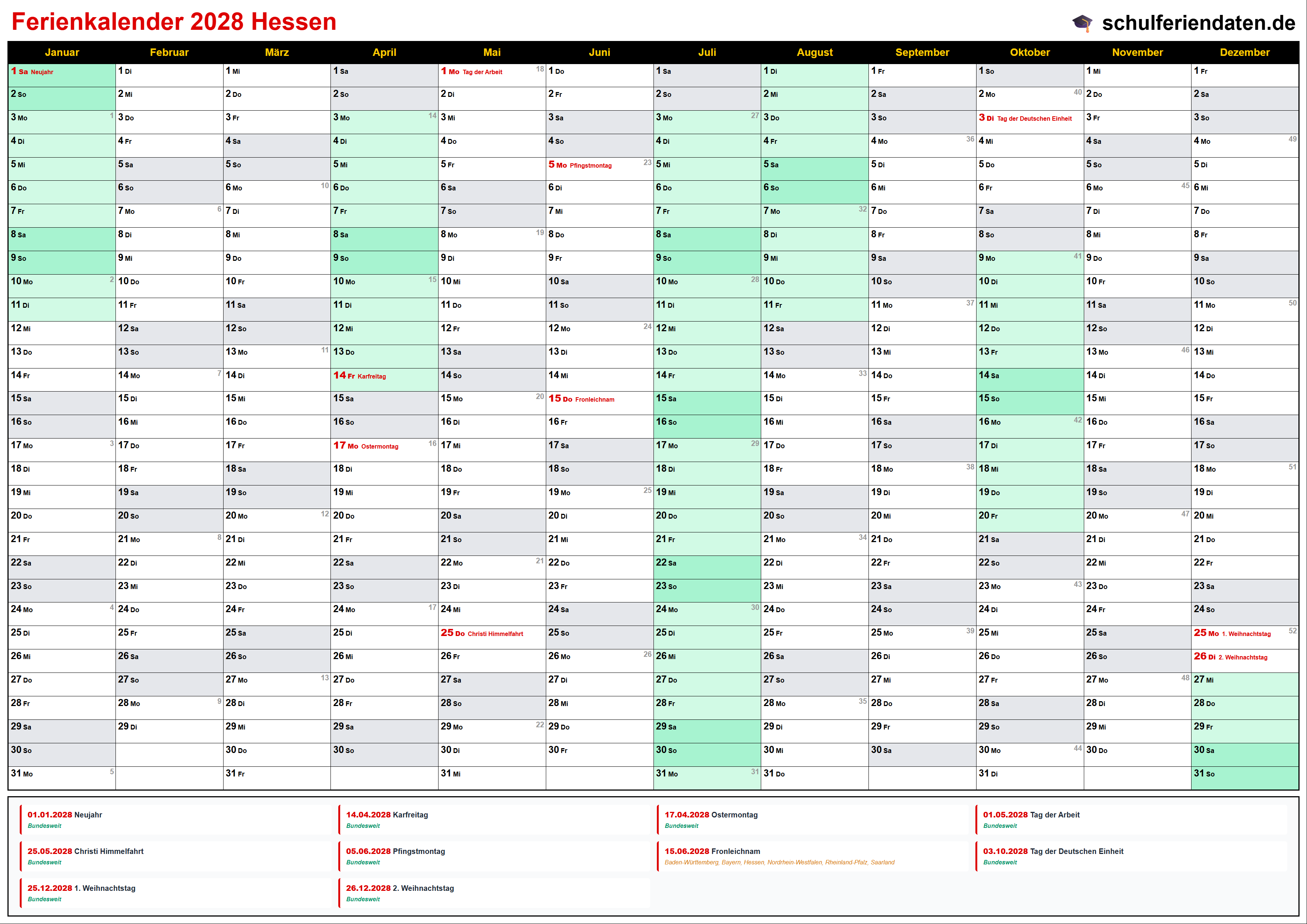 Hier finden Sie alle Schulferien 2028 in Hessen – übersichtlich im Kalender mit Kalenderwochen (KW) und markierten Feiertagen.
