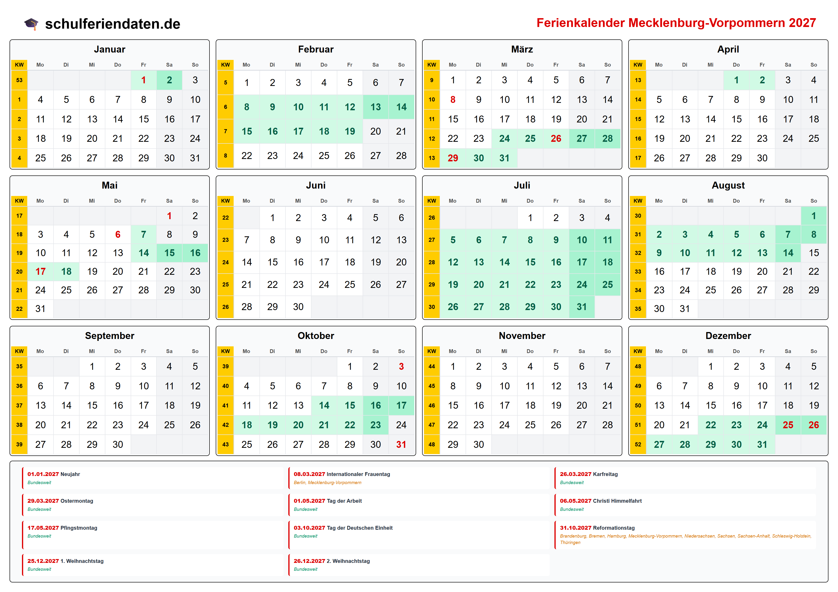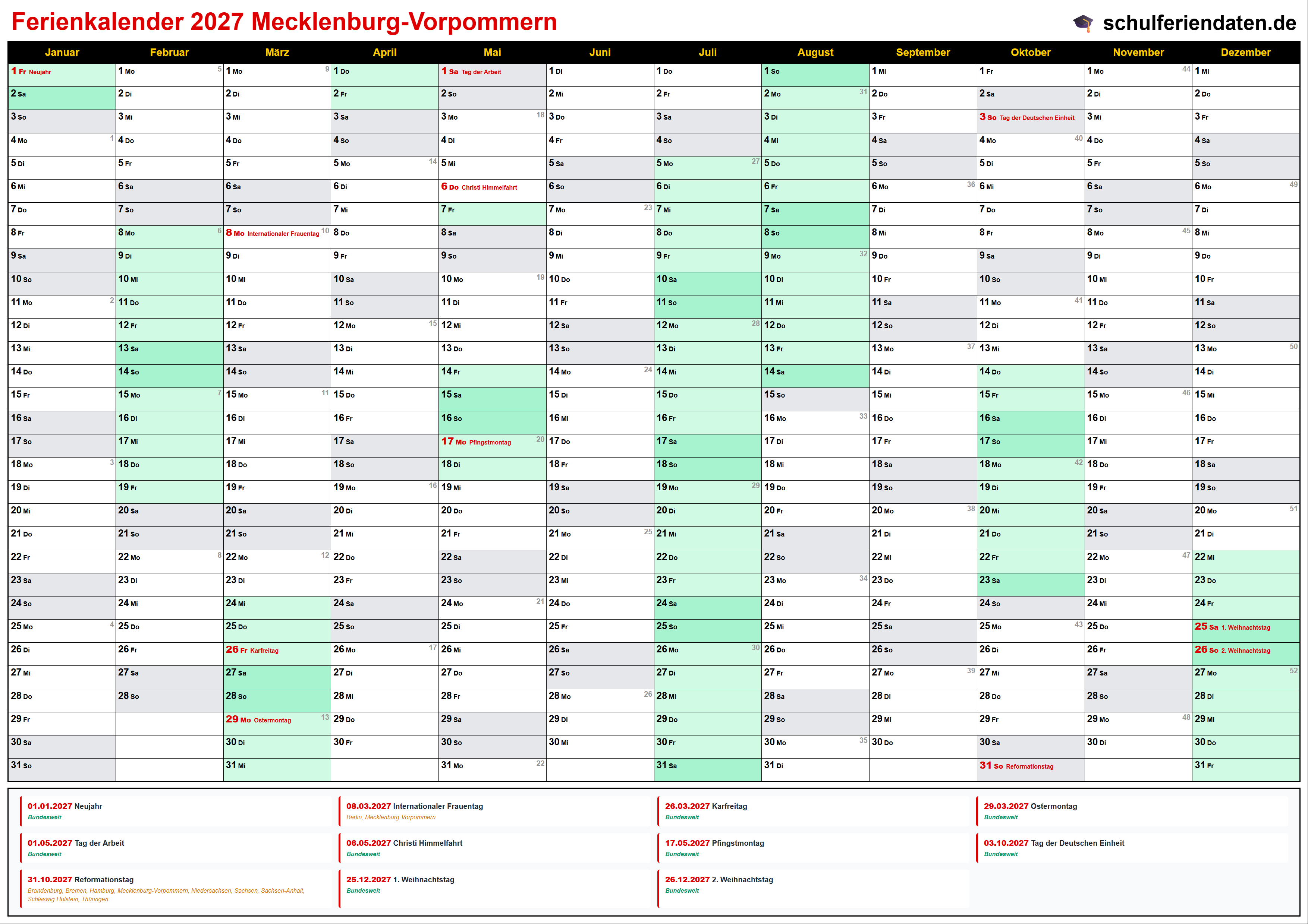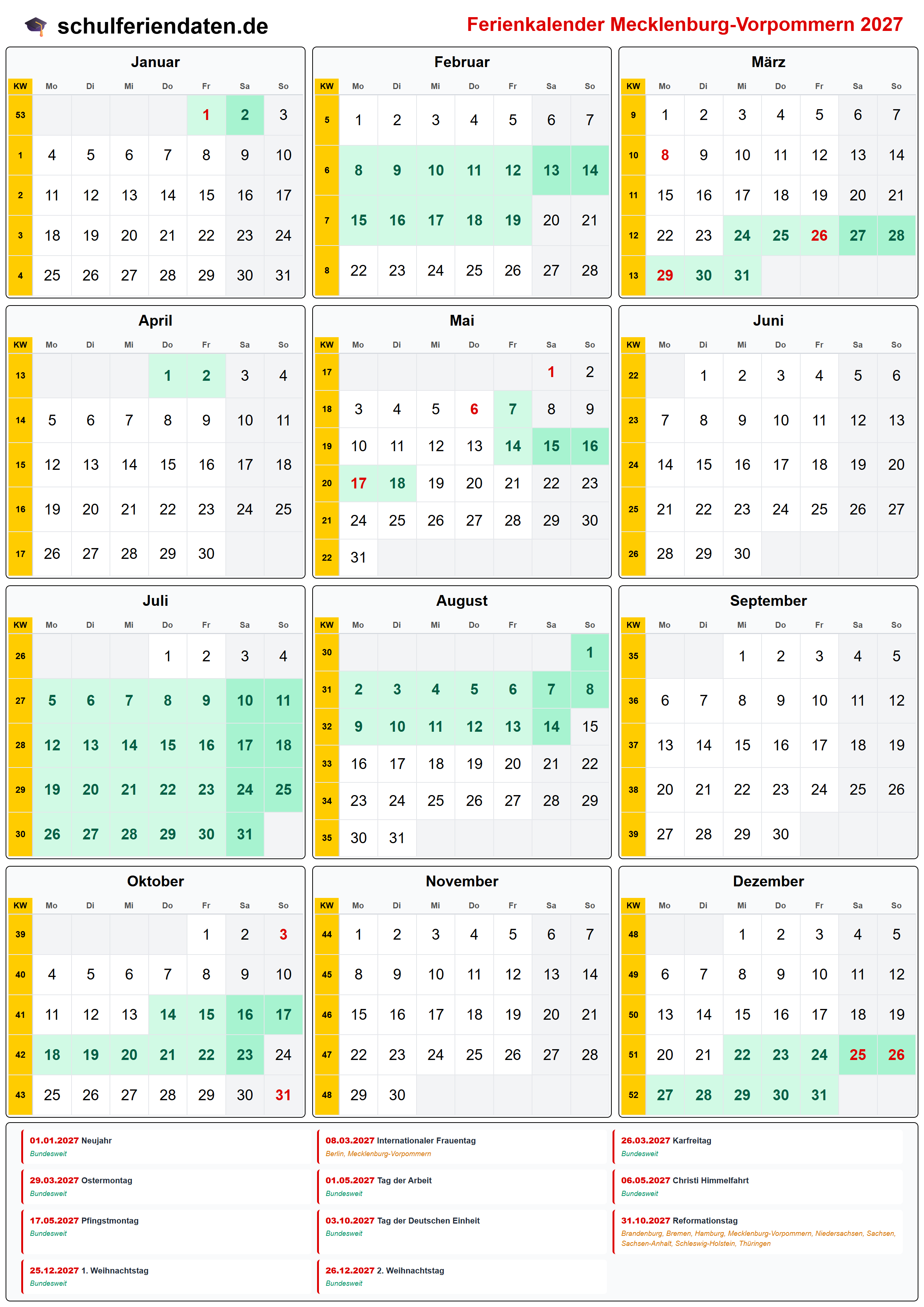 Ferienkalender für Mecklenburg-Vorpommern im Jahr 2027 mit allen Schulferien und gesetzlichen Feiertagen. Der Kalender zeigt alle Termine übersichtlich nach Monaten und Kalenderwochen und steht als PDF, PNG und iCal (.ics) zum Download bereit.