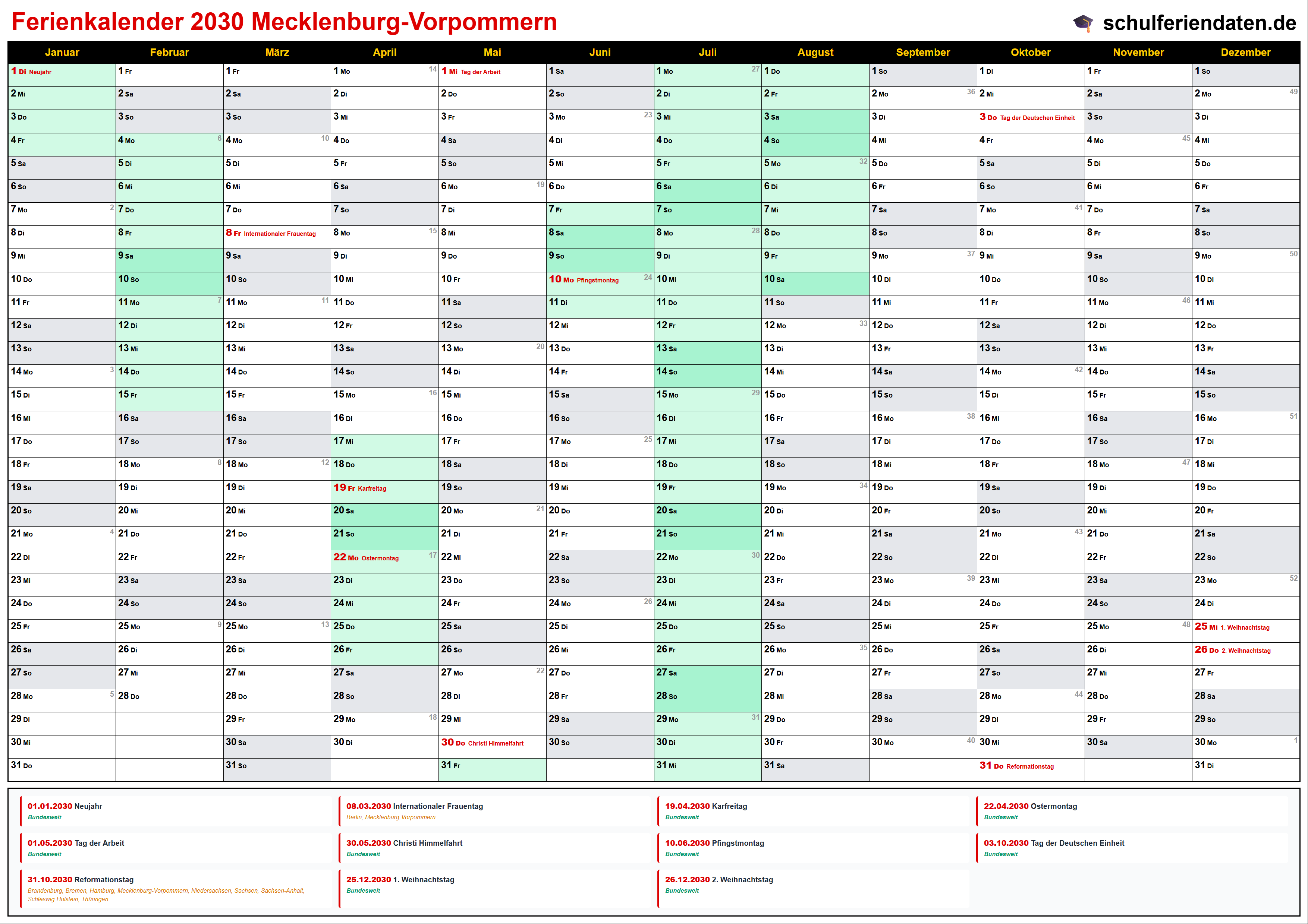 Ferienkalender für Mecklenburg-Vorpommern im Jahr 2030 mit allen Schulferien und gesetzlichen Feiertagen. Der Kalender zeigt alle Termine übersichtlich nach Monaten und Kalenderwochen und steht als PDF, PNG und iCal (.ics) zum Download bereit.