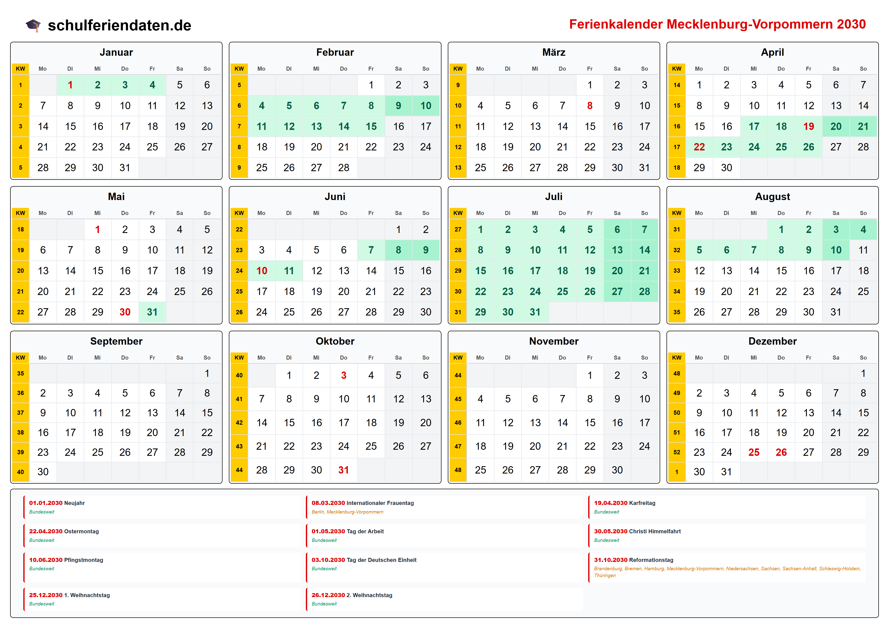 Hier finden Sie alle Schulferien 2030 in Mecklenburg-Vorpommern – übersichtlich im Kalender mit Kalenderwochen (KW) und markierten Feiertagen.