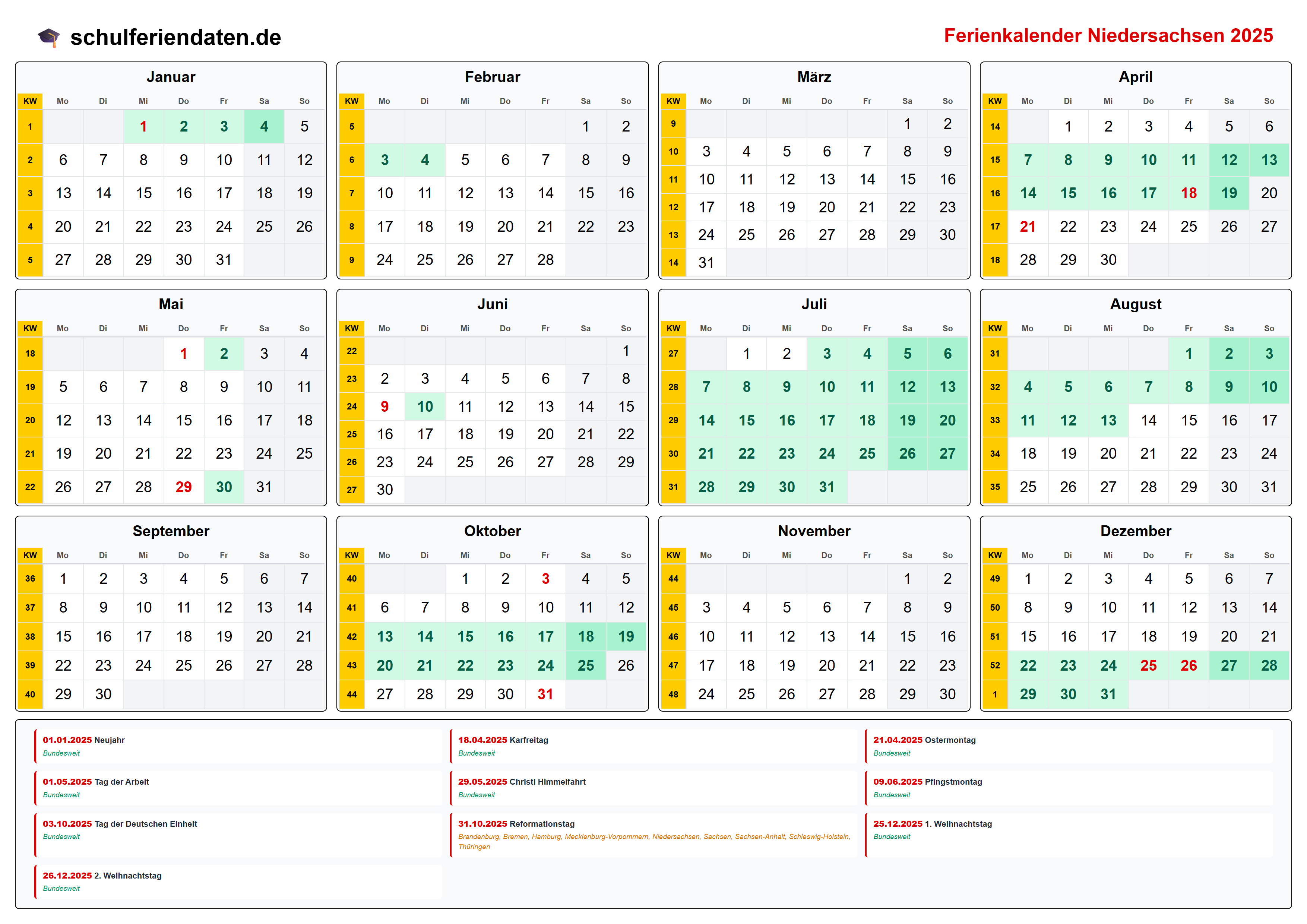 Laden Sie unseren Kalender 2025 mit den Feiertagen für Niedersachsen in den Formaten PDF oder PNG. Sie können die Kalender auch auf Ihrer Webseite einbinden oder in Ihrer Publikation abdrucken. In dem Fall muss schulferiendaten.de als Quelle angegeben bzw. verlinkt sein.