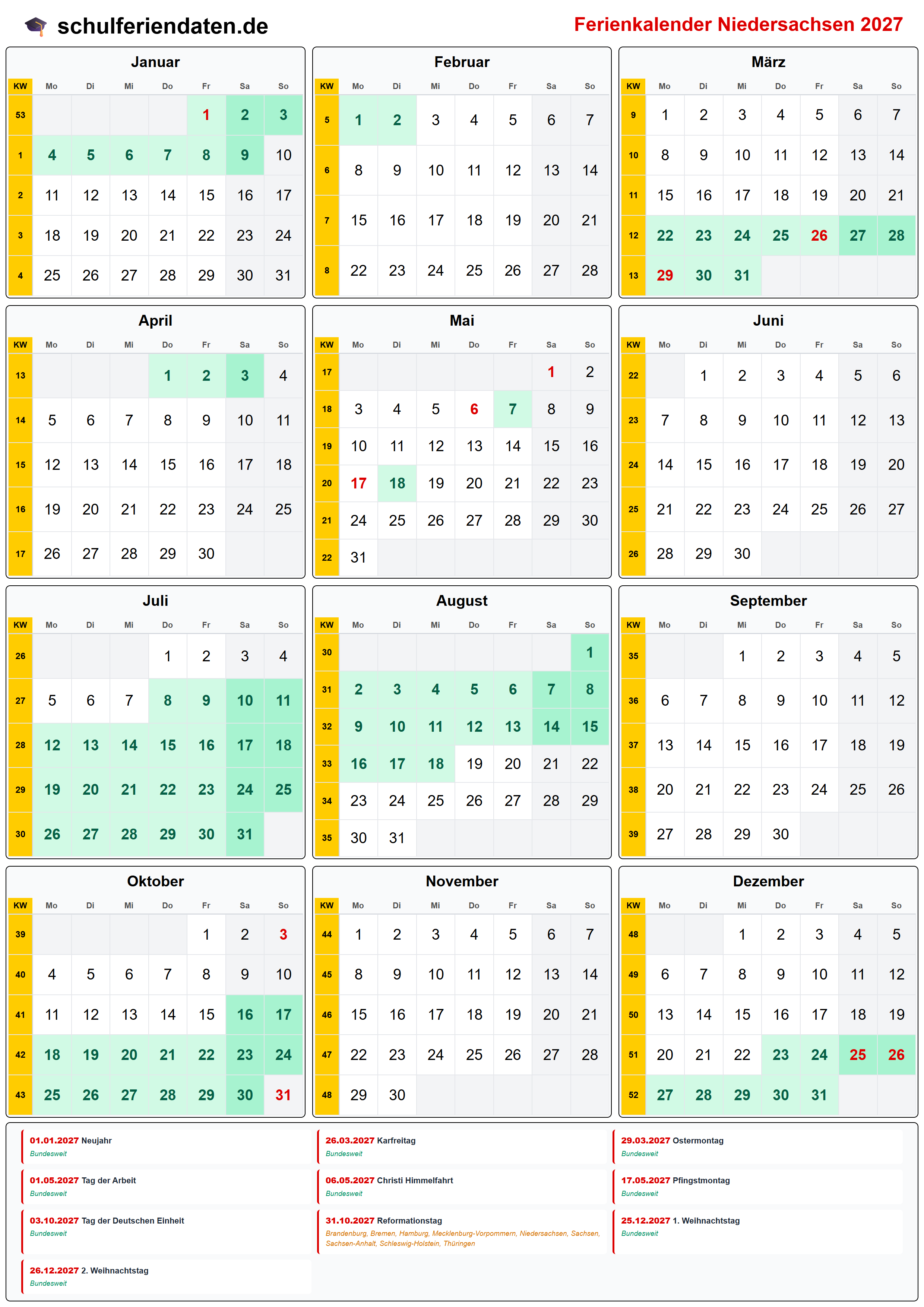 Ferienkalender für Niedersachsen im Jahr 2027 mit allen Schulferien und gesetzlichen Feiertagen. Der Kalender zeigt alle Termine übersichtlich nach Monaten und Kalenderwochen und steht als PDF, PNG und iCal (.ics) zum Download bereit.