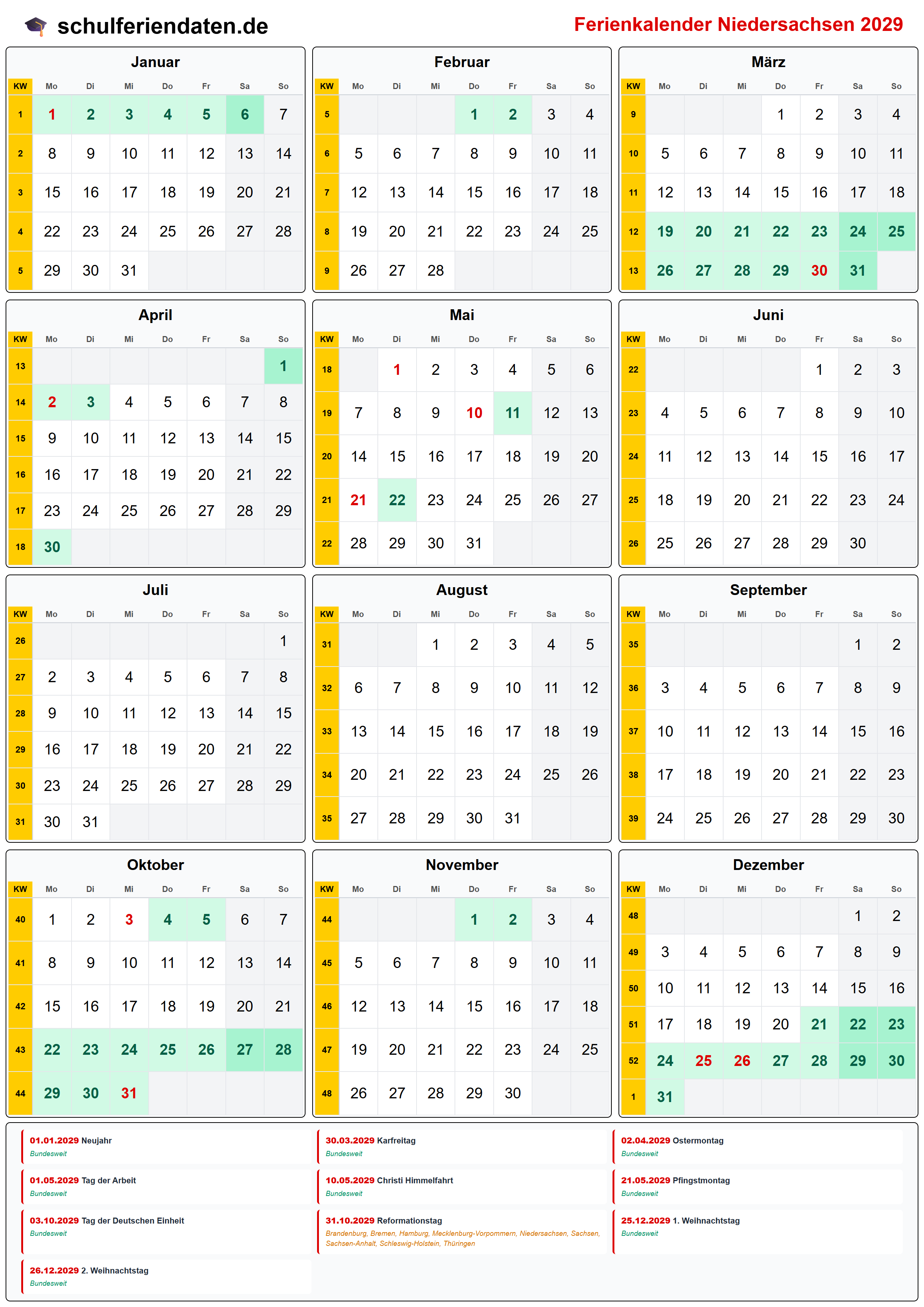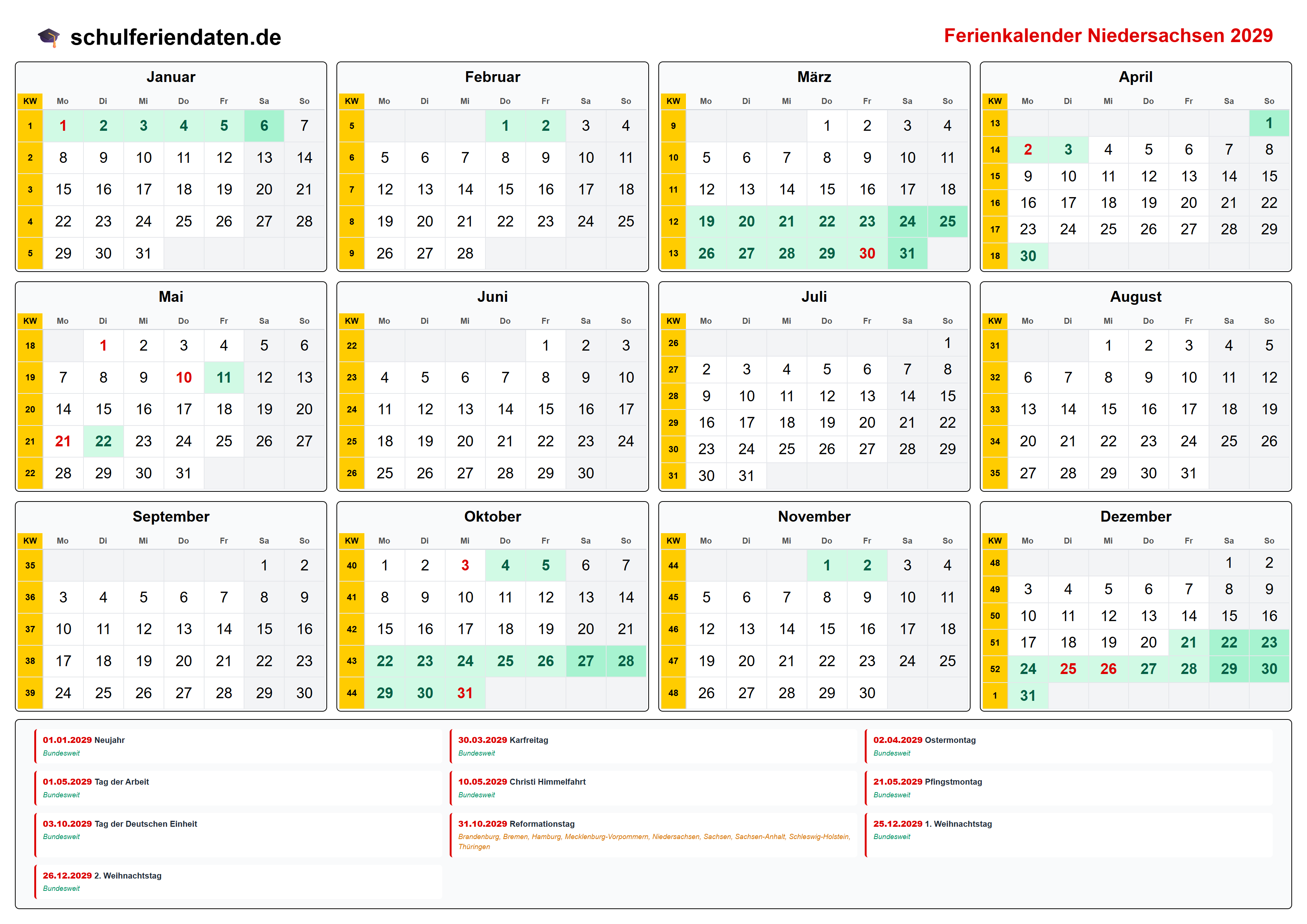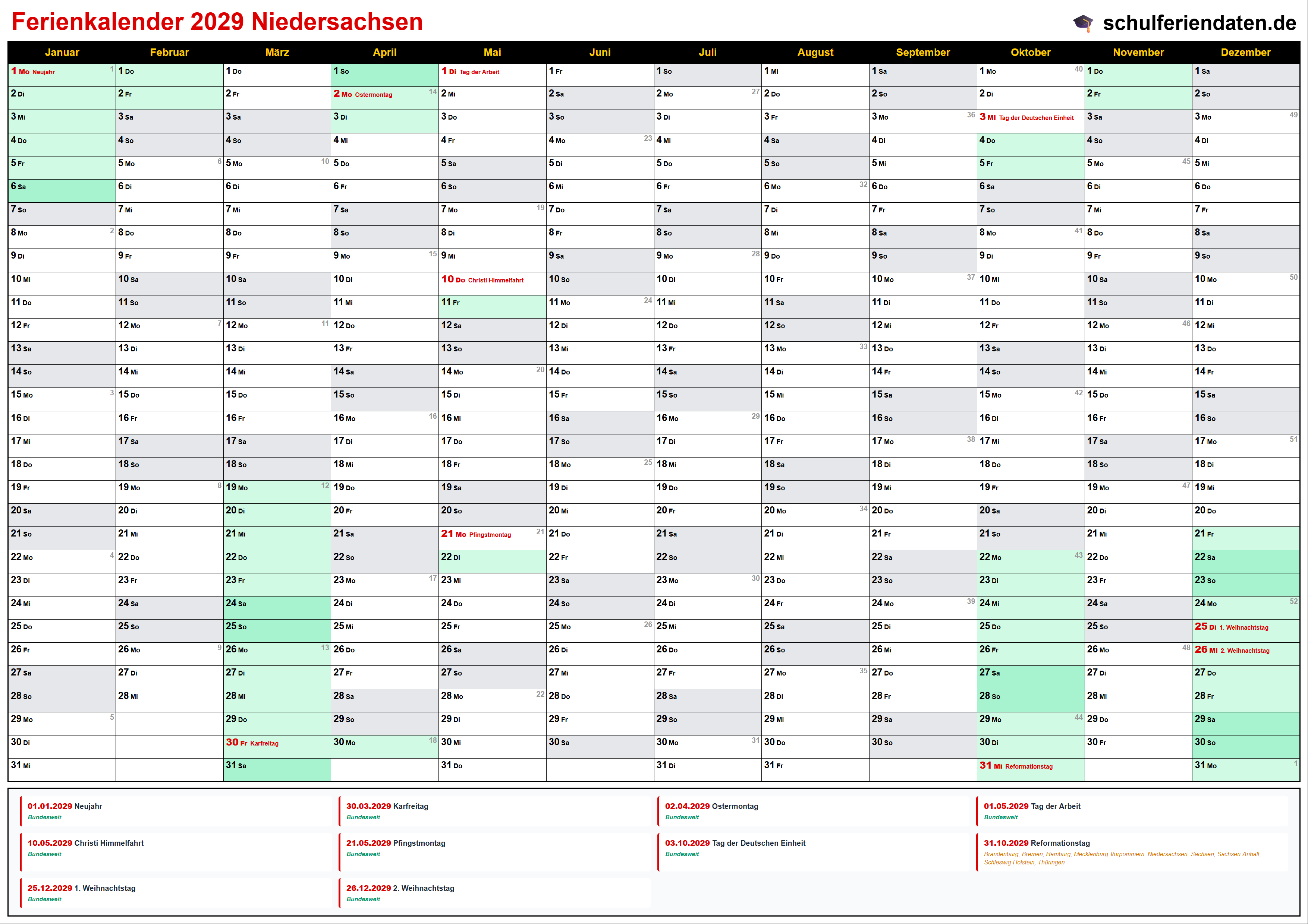 Laden Sie unseren Kalender 2029 mit den Feiertagen für Niedersachsen in den Formaten PDF oder PNG. Sie können die Kalender auch auf Ihrer Webseite einbinden oder in Ihrer Publikation abdrucken. In dem Fall muss schulferiendaten.de als Quelle angegeben bzw. verlinkt sein.