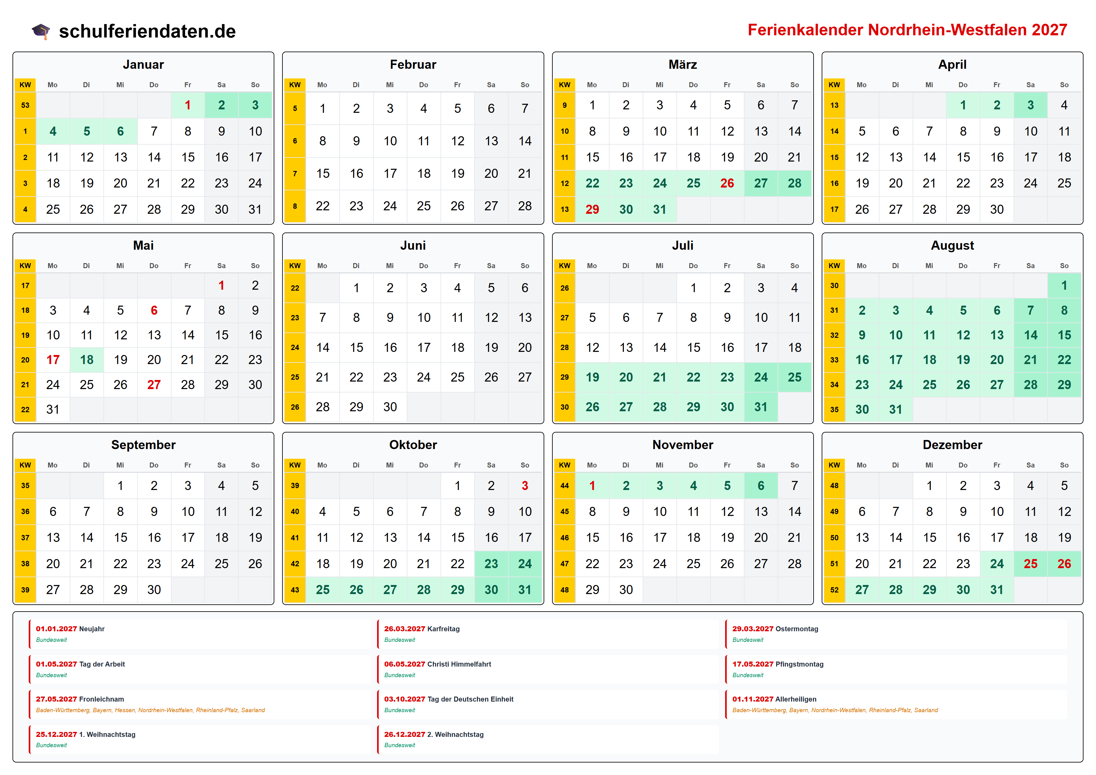 Ferienkalender für Nordrhein-Westfalen im Jahr 2027 mit allen Schulferien und gesetzlichen Feiertagen. Der Kalender zeigt alle Termine übersichtlich nach Monaten und Kalenderwochen und steht als PDF, PNG und iCal (.ics) zum Download bereit.
