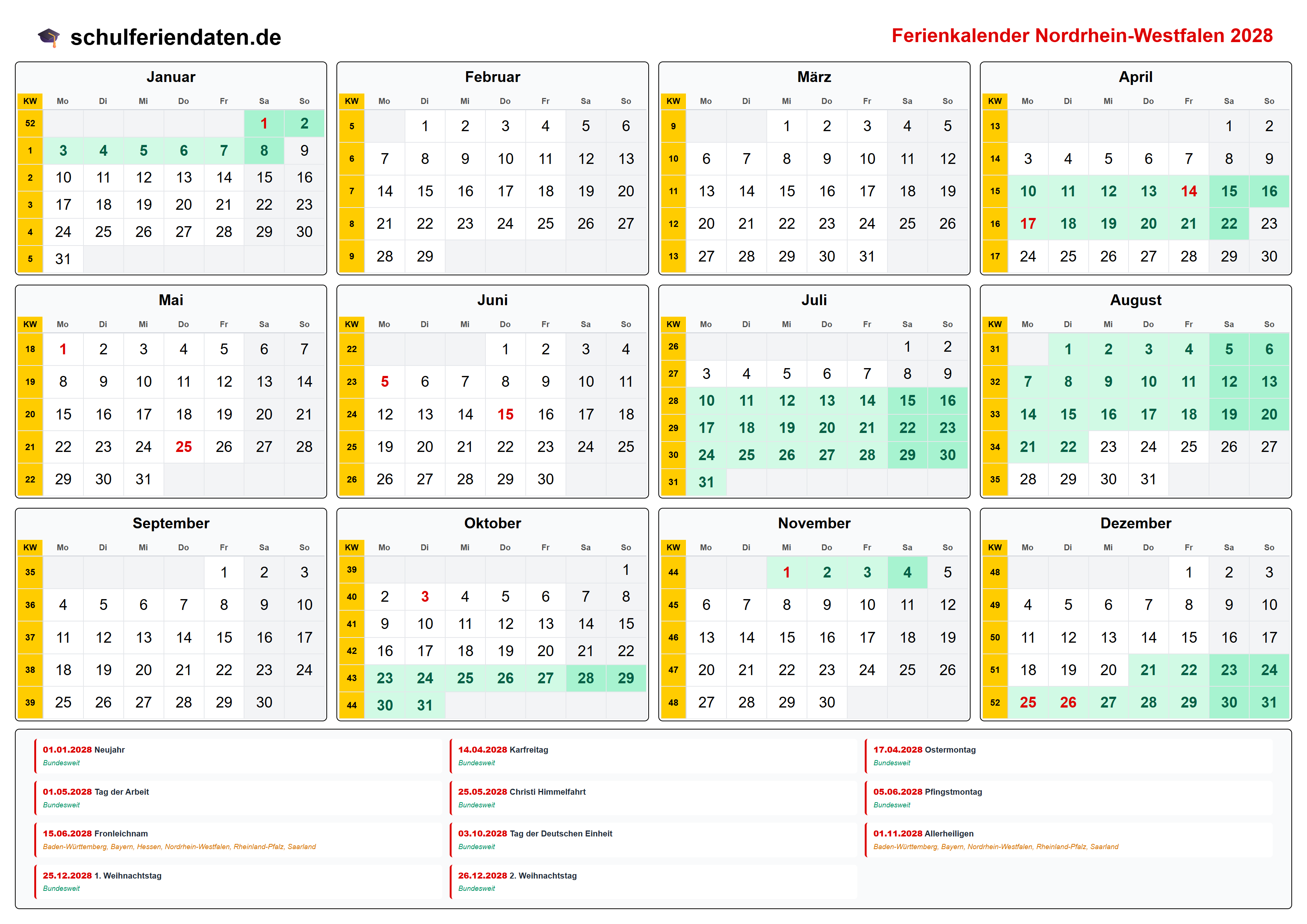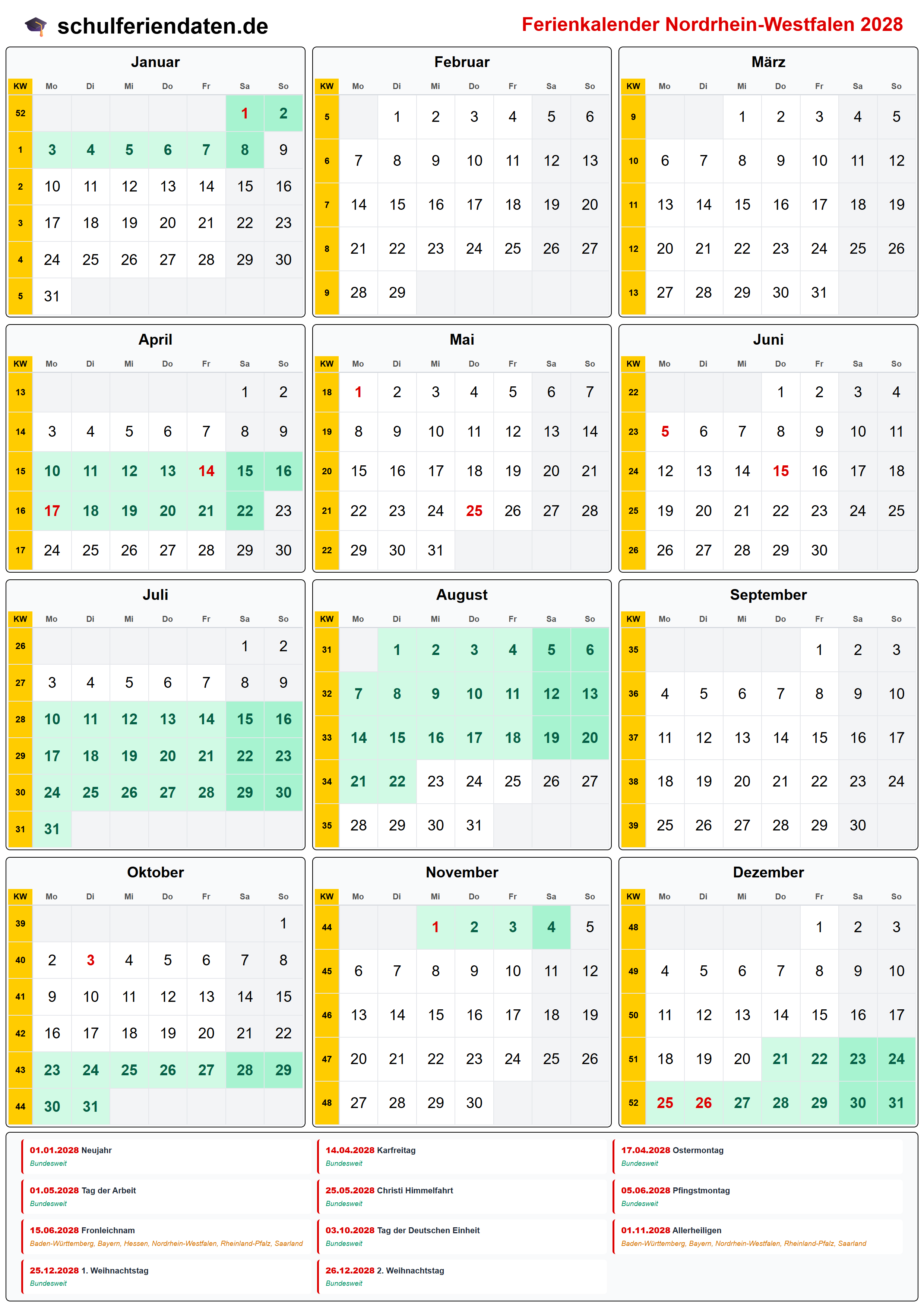Laden Sie unseren Kalender 2028 mit den Feiertagen für Nordrhein-Westfalen in den Formaten PDF oder PNG. Sie können die Kalender auch auf Ihrer Webseite einbinden oder in Ihrer Publikation abdrucken. In dem Fall muss schulferiendaten.de als Quelle angegeben bzw. verlinkt sein.