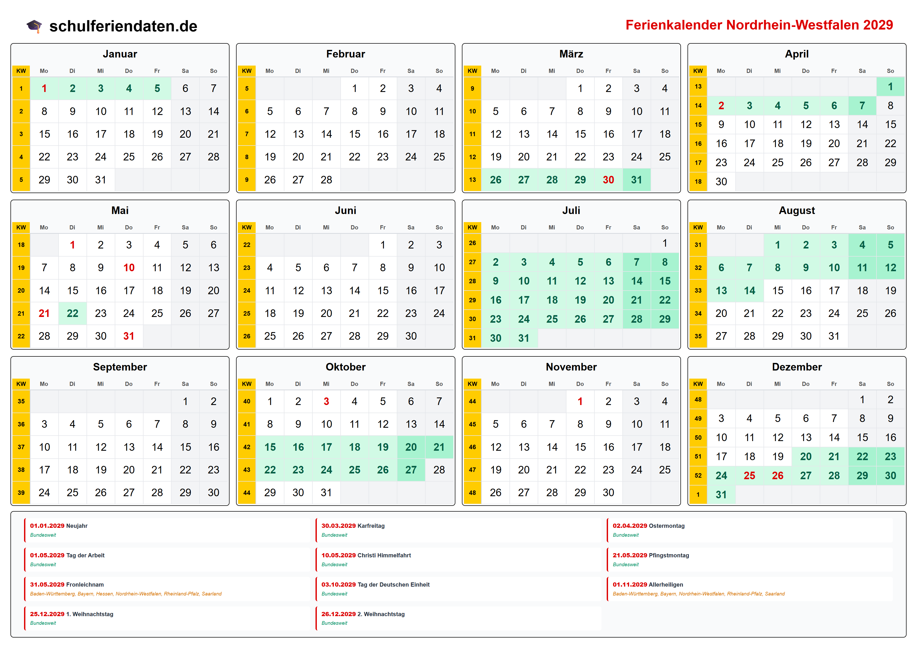 Ferienkalender für Nordrhein-Westfalen im Jahr 2029 mit allen Schulferien und gesetzlichen Feiertagen. Der Kalender zeigt alle Termine übersichtlich nach Monaten und Kalenderwochen und steht als PDF, PNG und iCal (.ics) zum Download bereit.