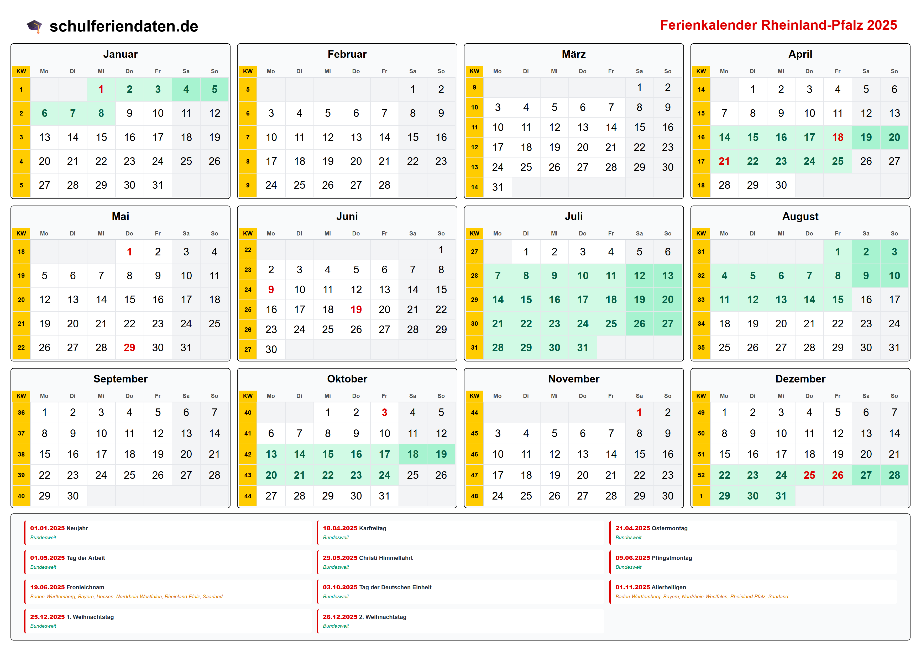 Laden Sie unseren Kalender 2025 mit den Feiertagen für Rheinland-Pfalz in den Formaten PDF oder PNG. Sie können die Kalender auch auf Ihrer Webseite einbinden oder in Ihrer Publikation abdrucken. In dem Fall muss schulferiendaten.de als Quelle angegeben bzw. verlinkt sein.