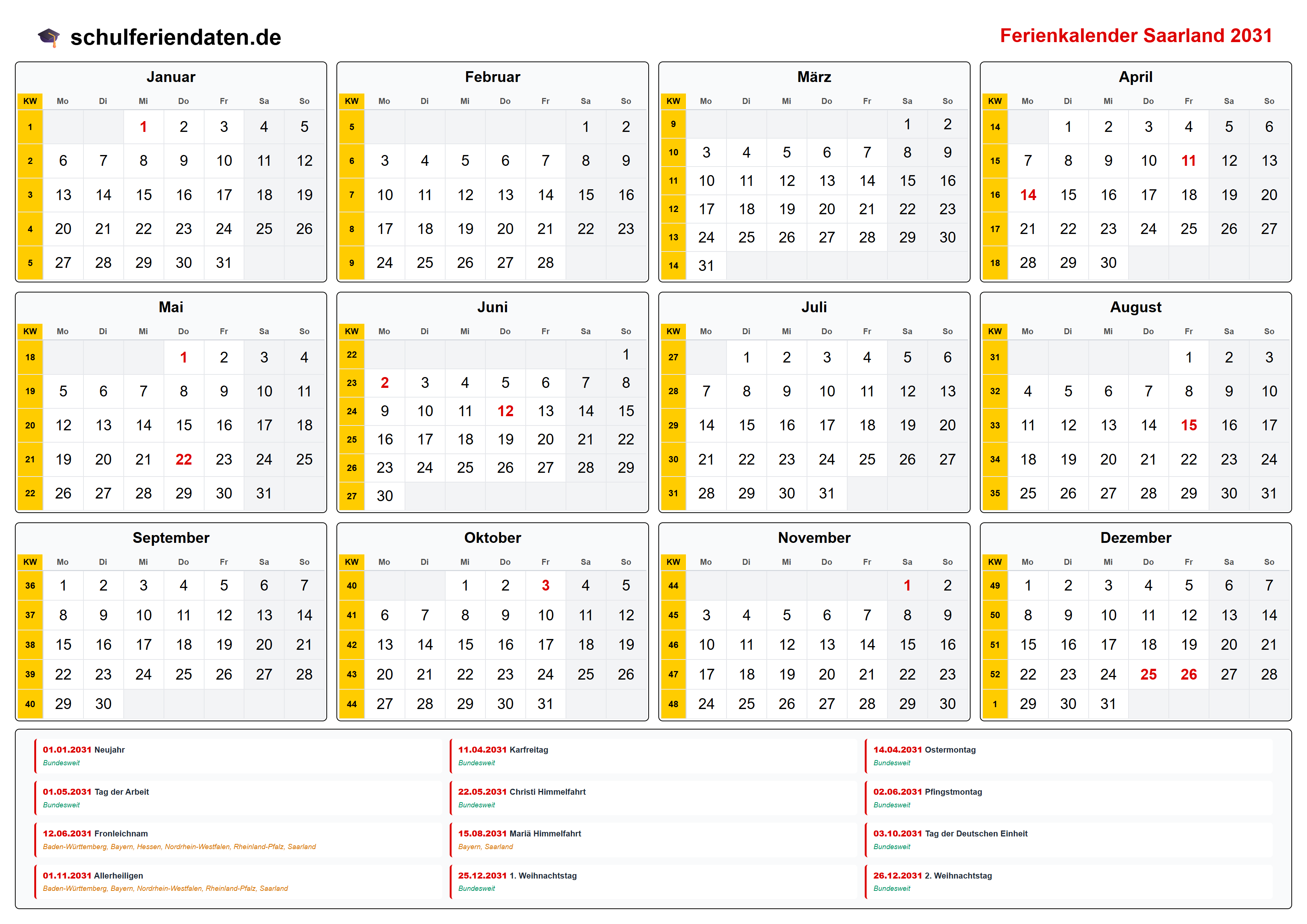 Ferienkalender für Saarland im Jahr 2031 mit allen Schulferien und gesetzlichen Feiertagen. Der Kalender zeigt alle Termine übersichtlich nach Monaten und Kalenderwochen und steht als PDF, PNG und iCal (.ics) zum Download bereit.