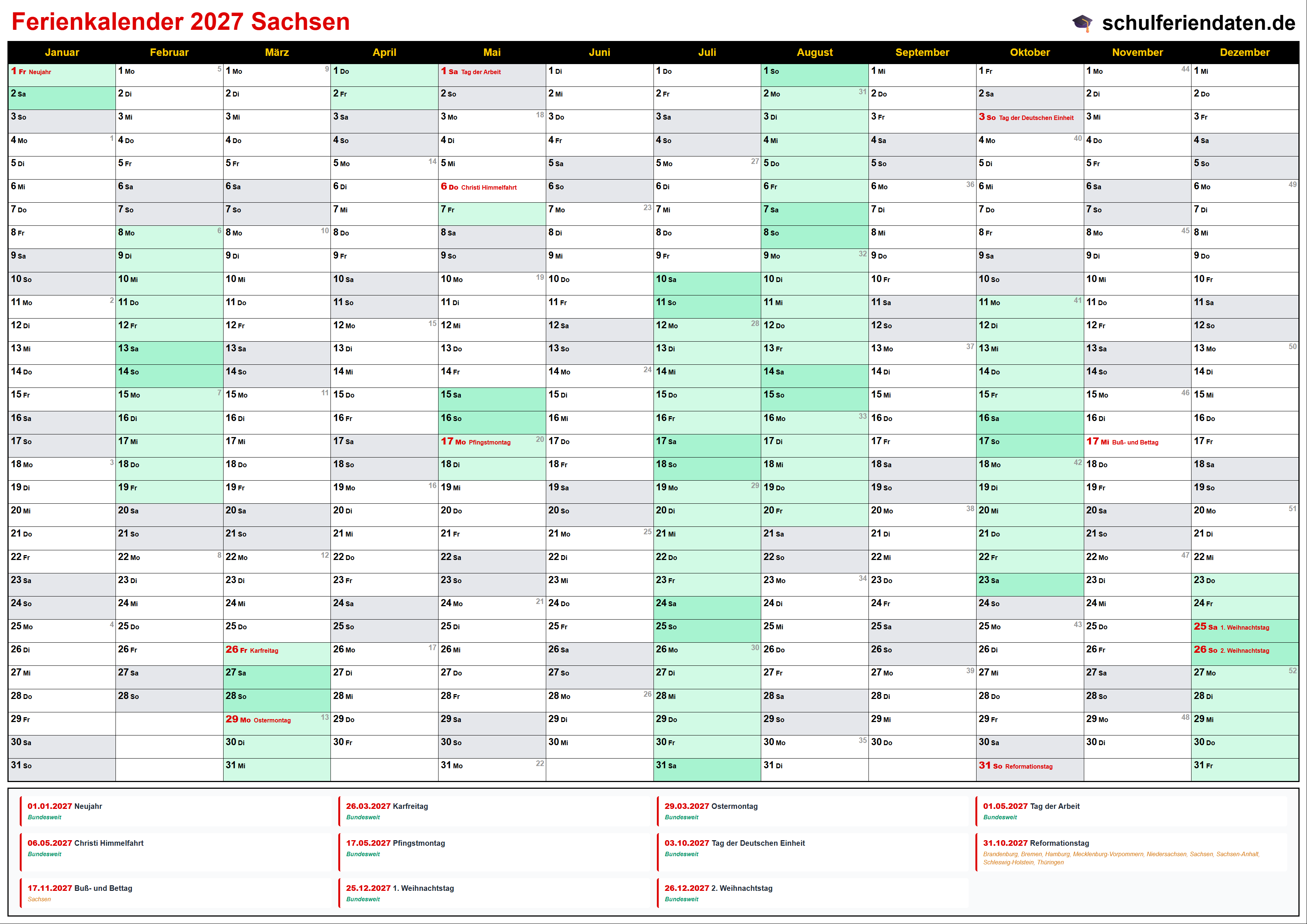 Ferienkalender für Sachsen im Jahr 2027 mit allen Schulferien und gesetzlichen Feiertagen. Der Kalender zeigt alle Termine übersichtlich nach Monaten und Kalenderwochen und steht als PDF, PNG und iCal (.ics) zum Download bereit.