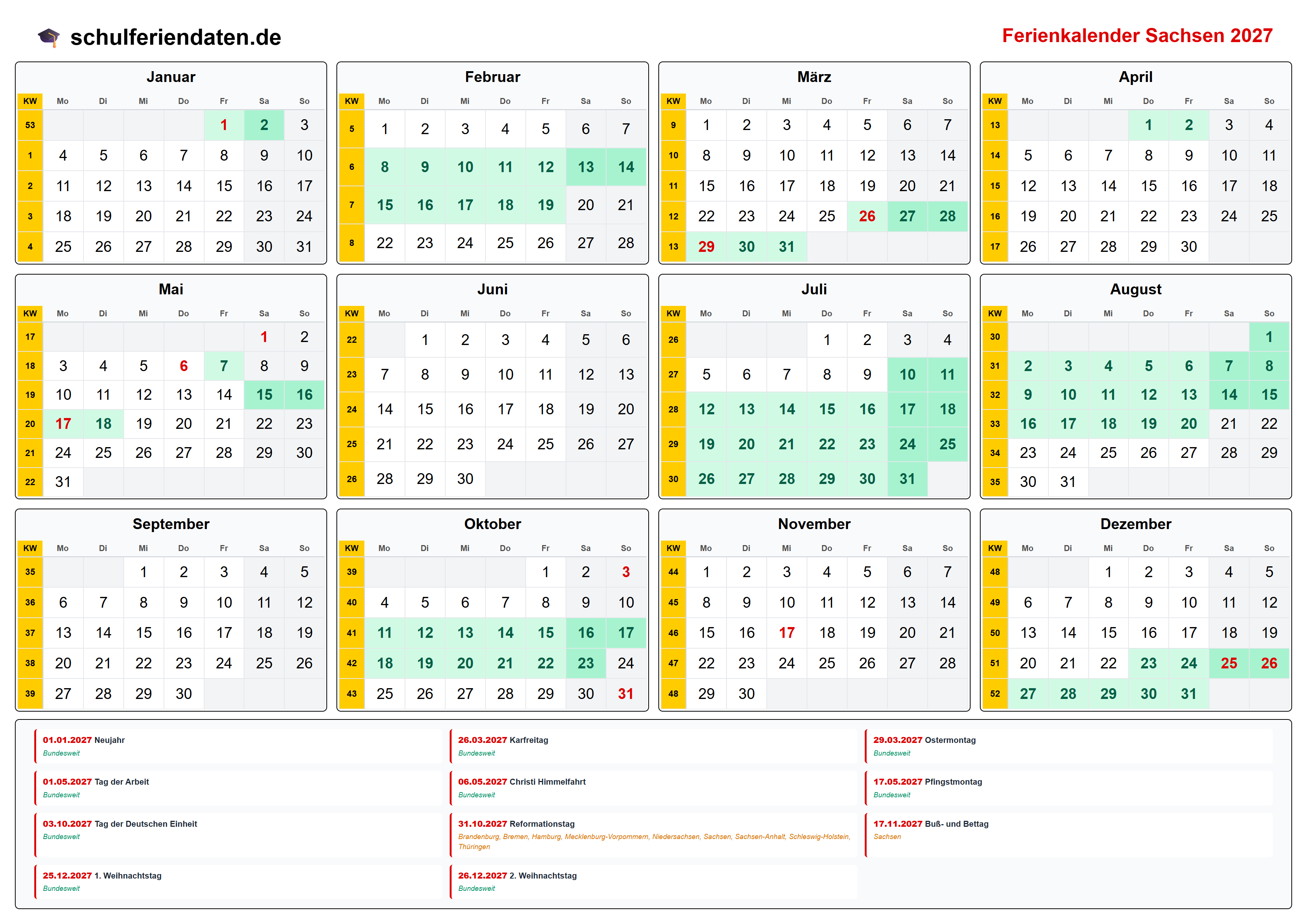 Laden Sie unseren Kalender 2027 mit den Feiertagen für Sachsen in den Formaten PDF oder PNG. Sie können die Kalender auch auf Ihrer Webseite einbinden oder in Ihrer Publikation abdrucken. In dem Fall muss schulferiendaten.de als Quelle angegeben bzw. verlinkt sein.
