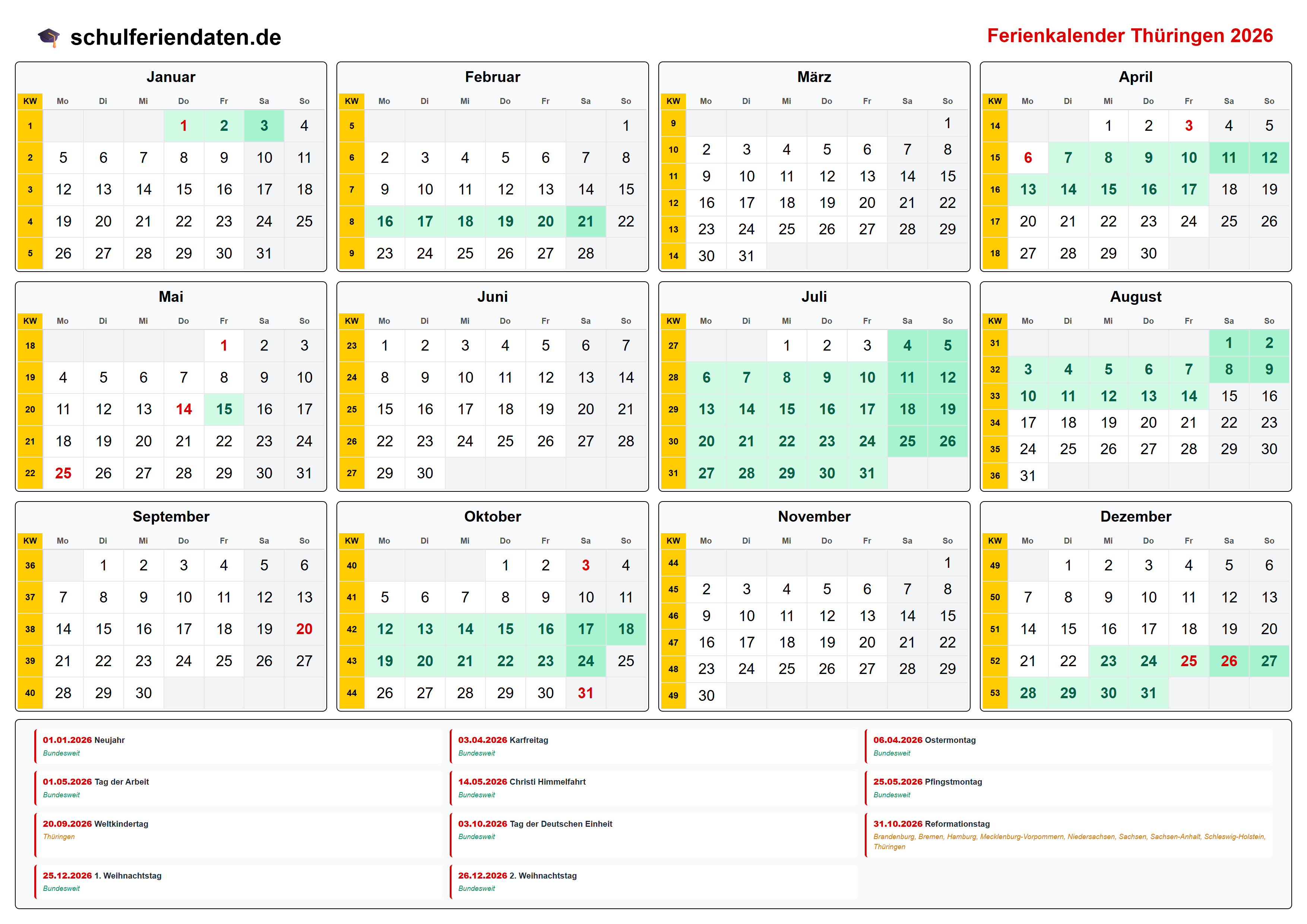 Laden Sie unseren Kalender 2026 mit den Feiertagen für Thüringen in den Formaten PDF oder PNG. Sie können die Kalender auch auf Ihrer Webseite einbinden oder in Ihrer Publikation abdrucken. In dem Fall muss schulferiendaten.de als Quelle angegeben bzw. verlinkt sein.