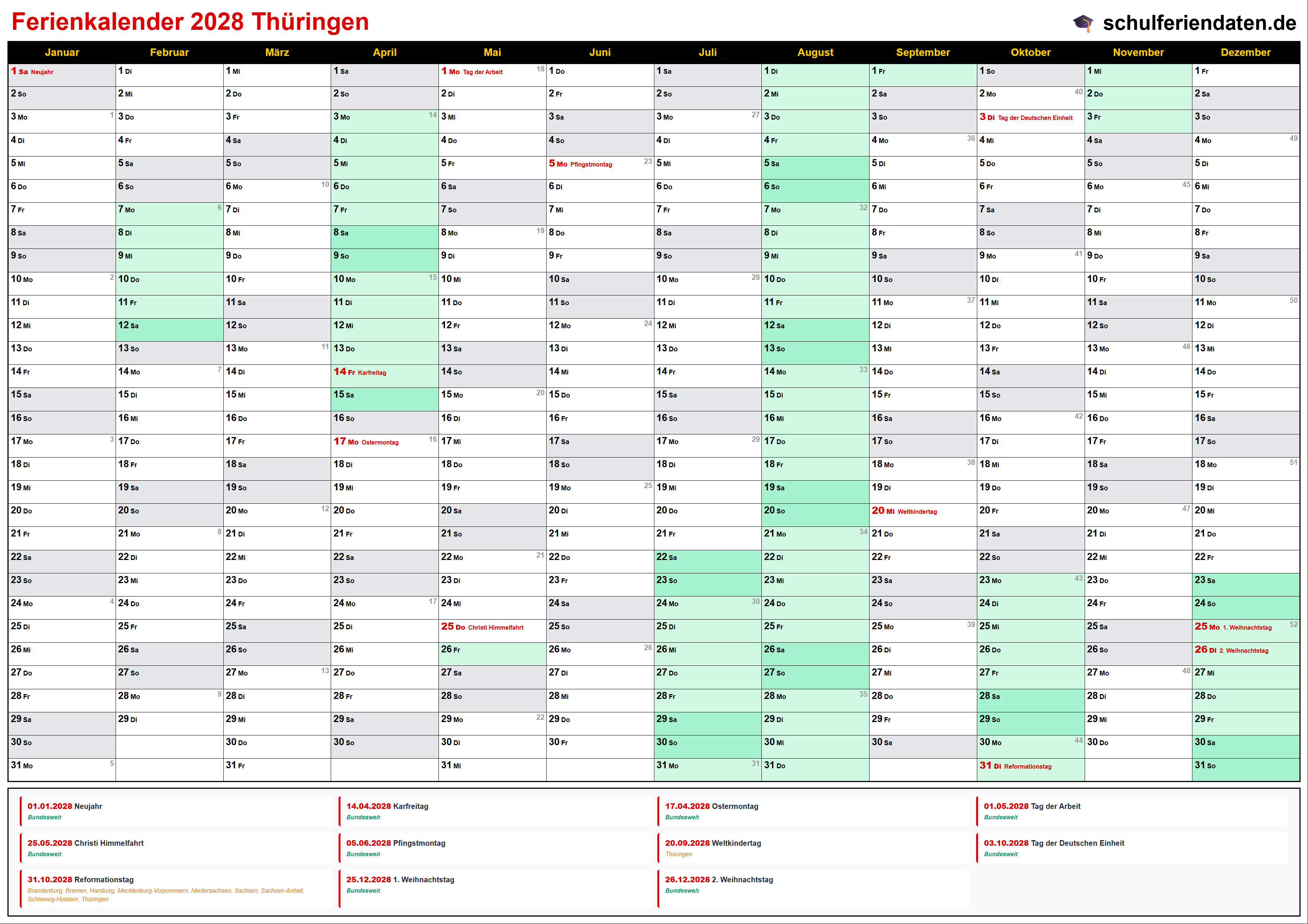 Laden Sie unseren Kalender 2028 mit den Feiertagen für Thüringen in den Formaten PDF oder PNG. Sie können die Kalender auch auf Ihrer Webseite einbinden oder in Ihrer Publikation abdrucken. In dem Fall muss schulferiendaten.de als Quelle angegeben bzw. verlinkt sein.