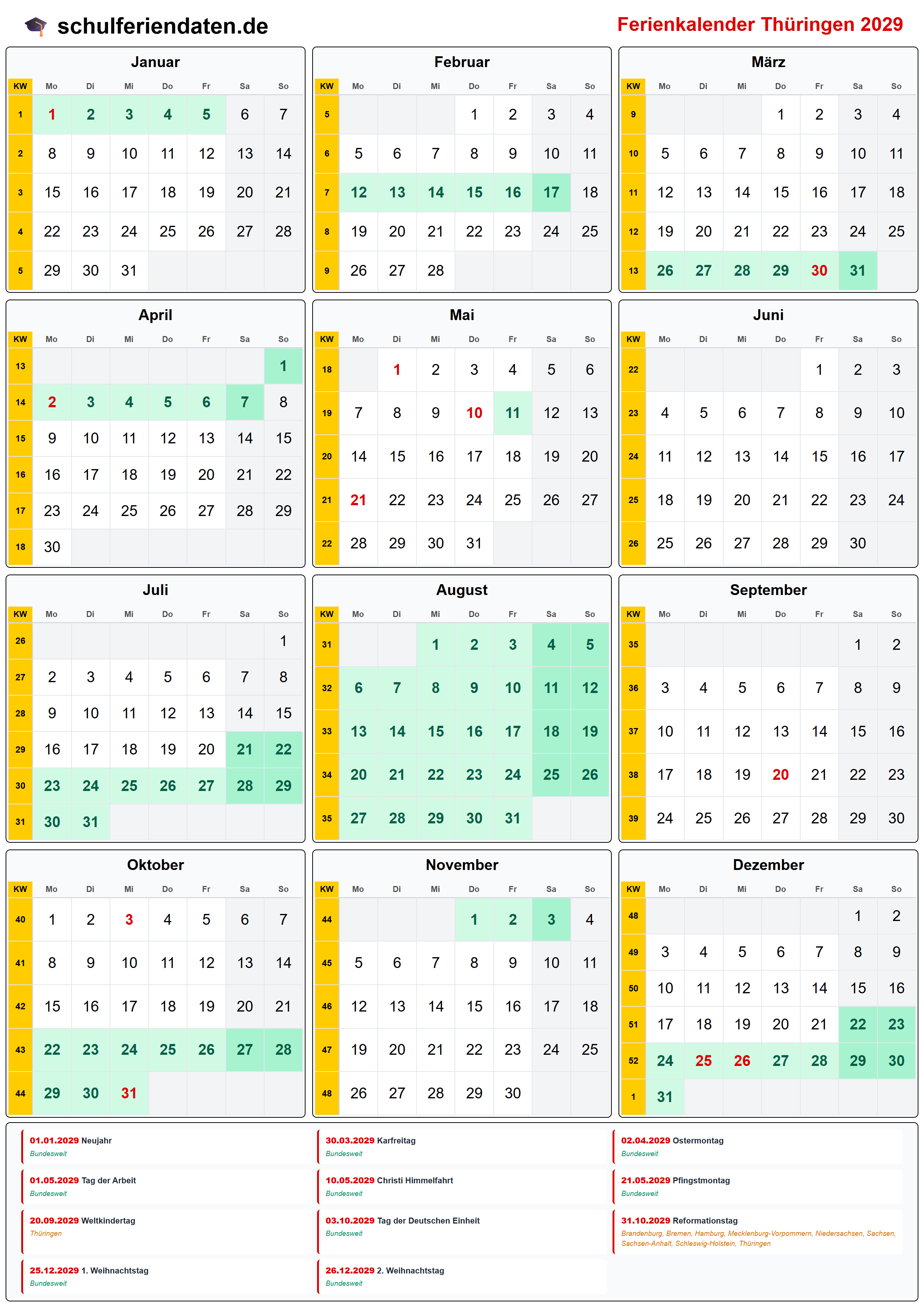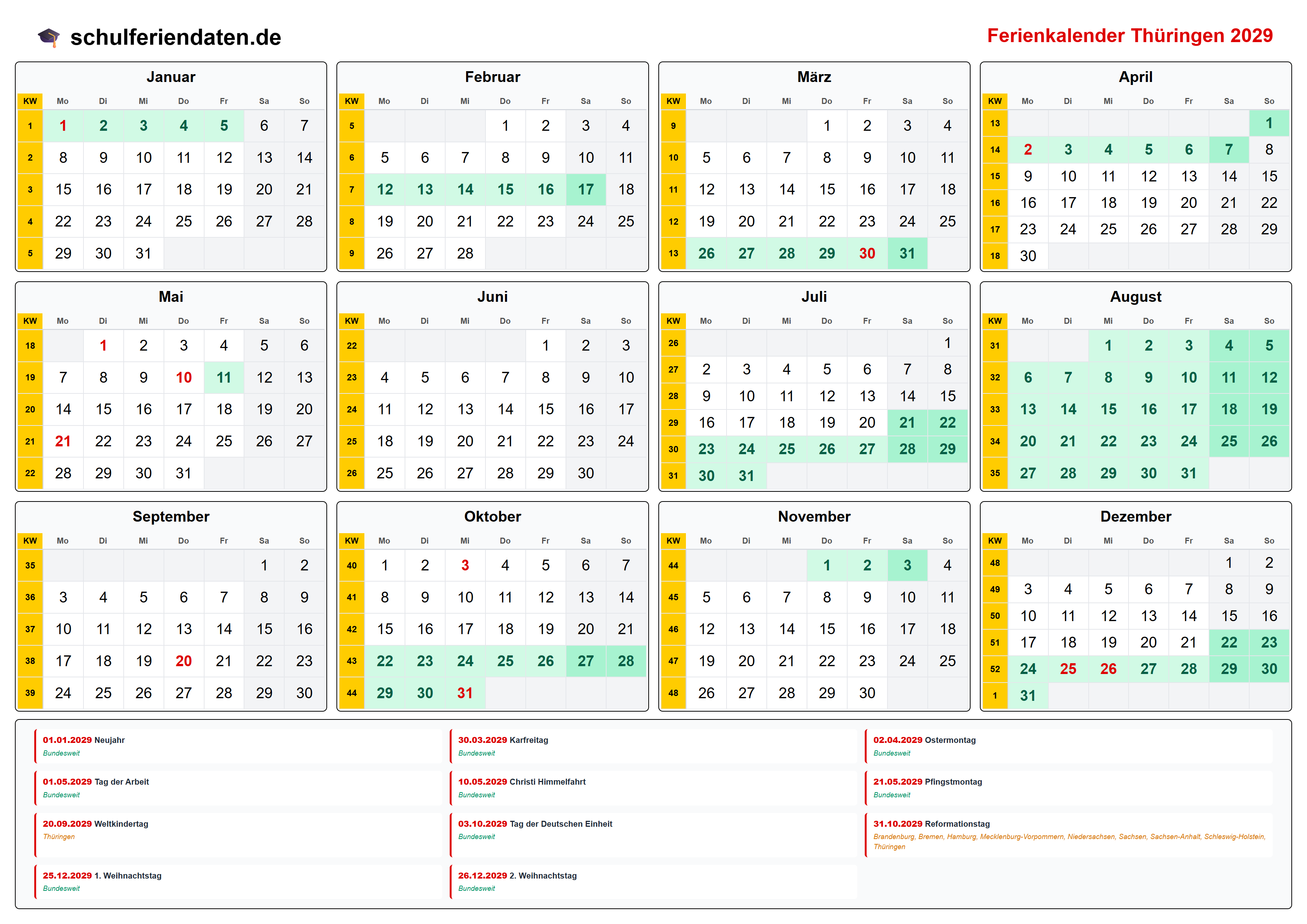 Hier finden Sie alle Schulferien 2029 in Thüringen – übersichtlich im Kalender mit Kalenderwochen (KW) und markierten Feiertagen.
